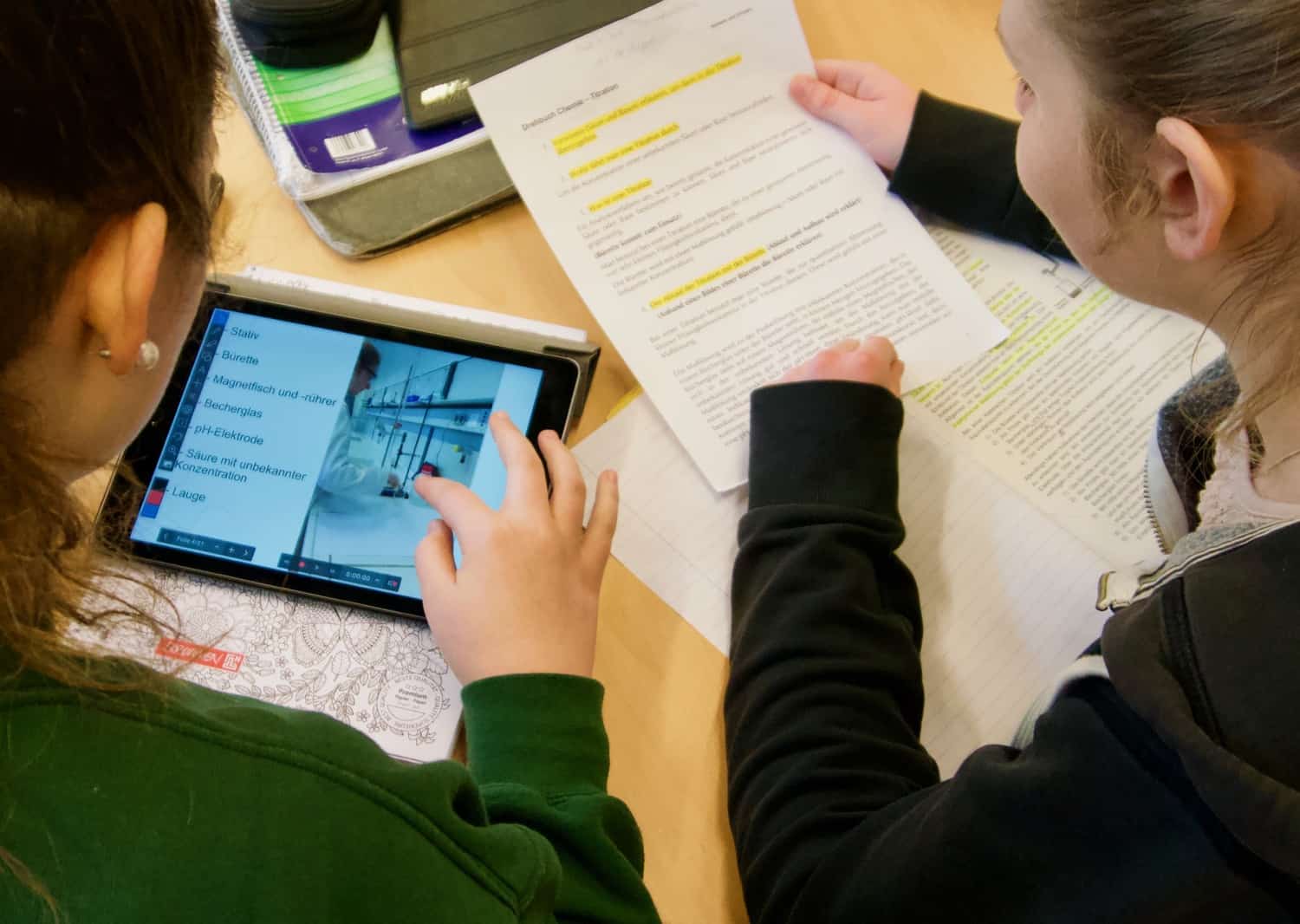Bei den inhaltsbezogenen und prozessbezogenen Kriterien handelt es sich um ausgewählte Beispiele. Die gesamte Liste ist auf dem entsprechenden Arbeitsmaterial im Downloadbereich zu finden. Neben diesen Kriterien erhalten die Lernenden zwei Arbeitsmaterialien, die das Verfahren der Titration theoretisch und praktisch darstellt und als Grundlage für die Erstellung des Erklärvideos dient. Jedoch ist das Vorwissen aus den vorangegangenen Unterrichtsstunden ebenfalls von großer Bedeutung, um das Thema ausführlich und vollständig bearbeiten zu können.